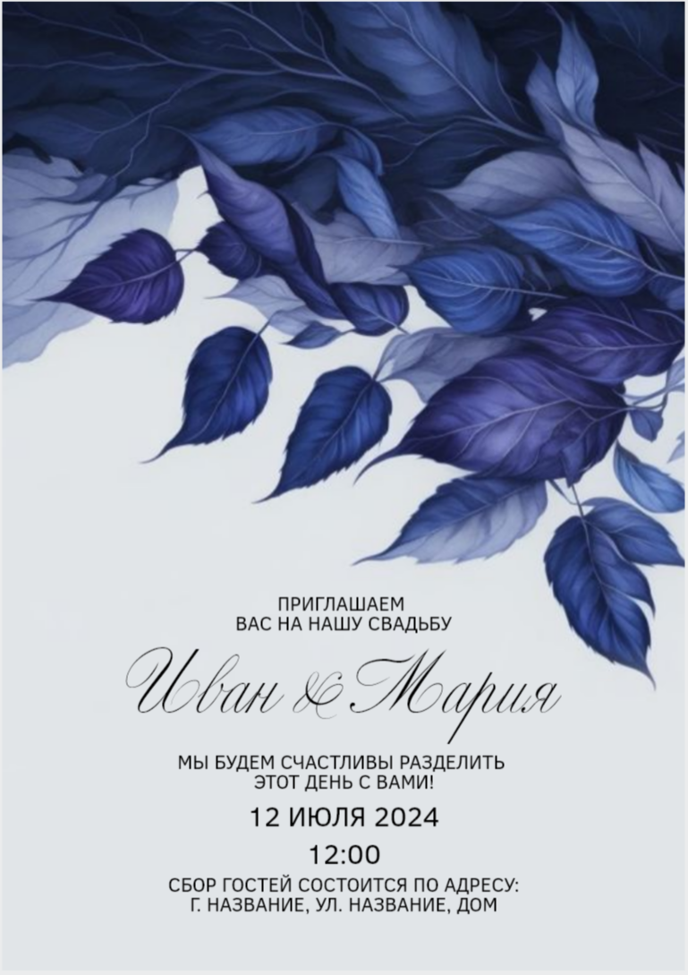 Свадебные приглашения, будь то изящные цифровые послания или осязаемые шедевры типографского искусства, – это первый луч волшебного свадебного дня! Позвольте индивидуальному дизайну стать зеркалом вашей любви, отражающим всю красоту и предвкушение предстоящего торжества.
