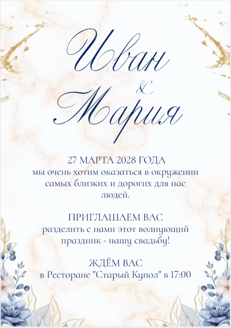 Выберите наиболее удобный для вас способ поделиться радостью и пригласить близких и дорогих людей на этот особый день.