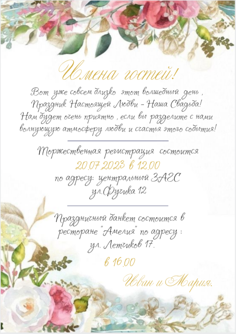 Выберите наиболее удобный для вас способ поделиться радостью и пригласить близких и дорогих людей на этот особый день.