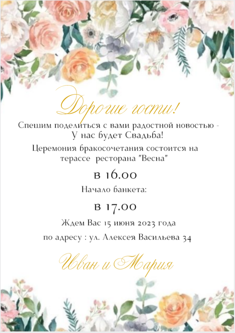 Выберите наиболее удобный для вас способ поделиться радостью и пригласить близких и дорогих людей на этот особый день.