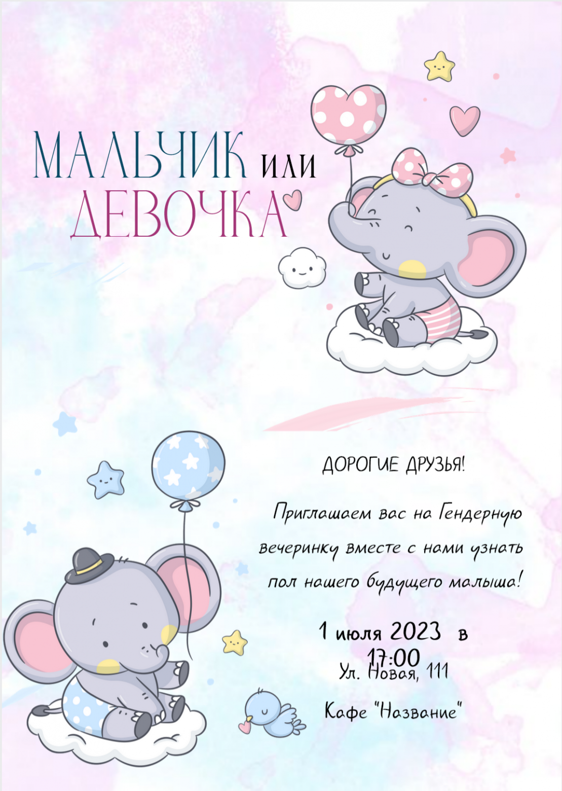 Приглашение на гендер-пати, заполненное, в цифровом формате