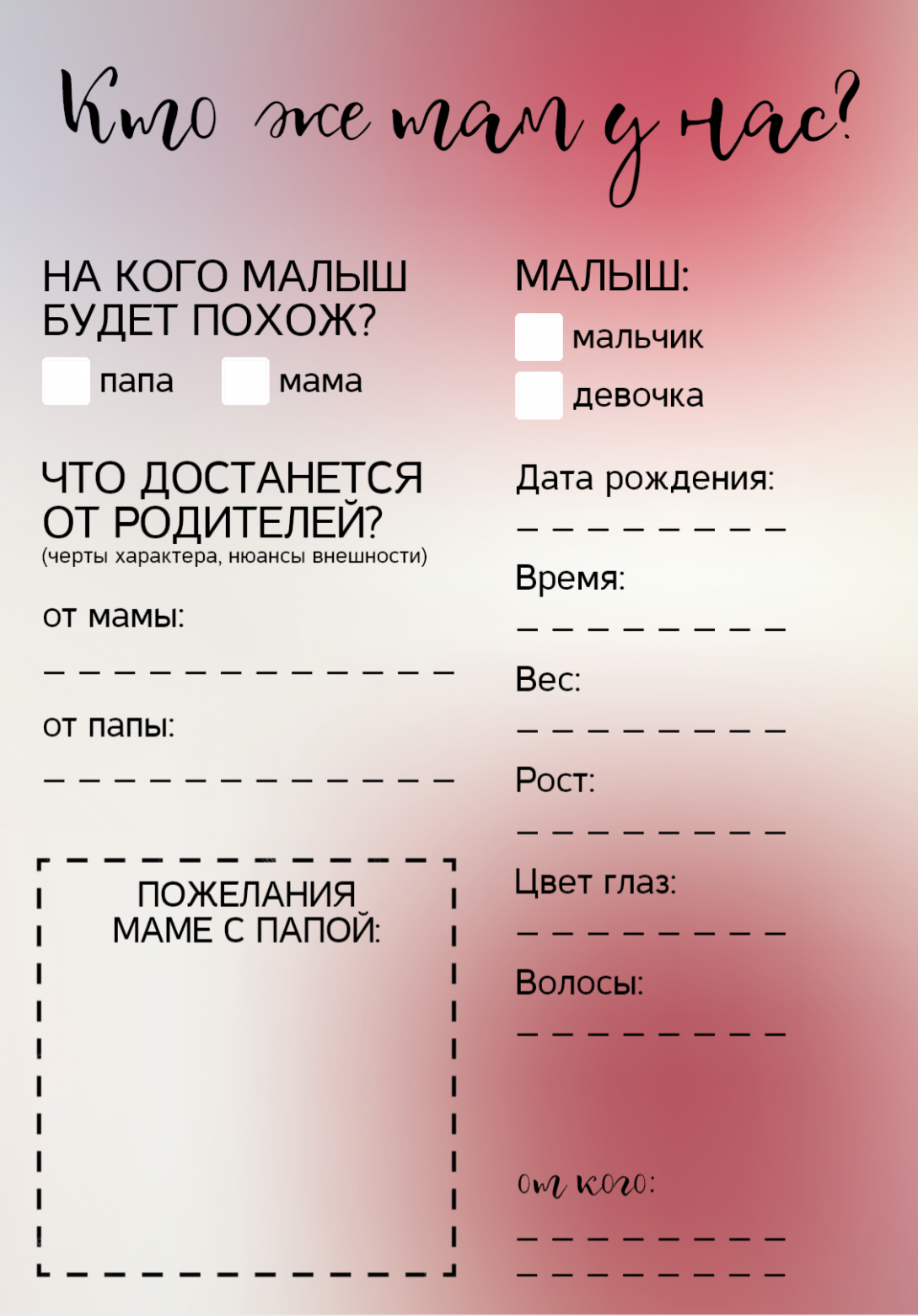 • Развлеките гостей и создайте атмосферу: Анкеты добавят интерактивности вашему празднику. Гости с удовольствием заполнят их, делясь своими мыслями и предсказаниями о поле малыша.