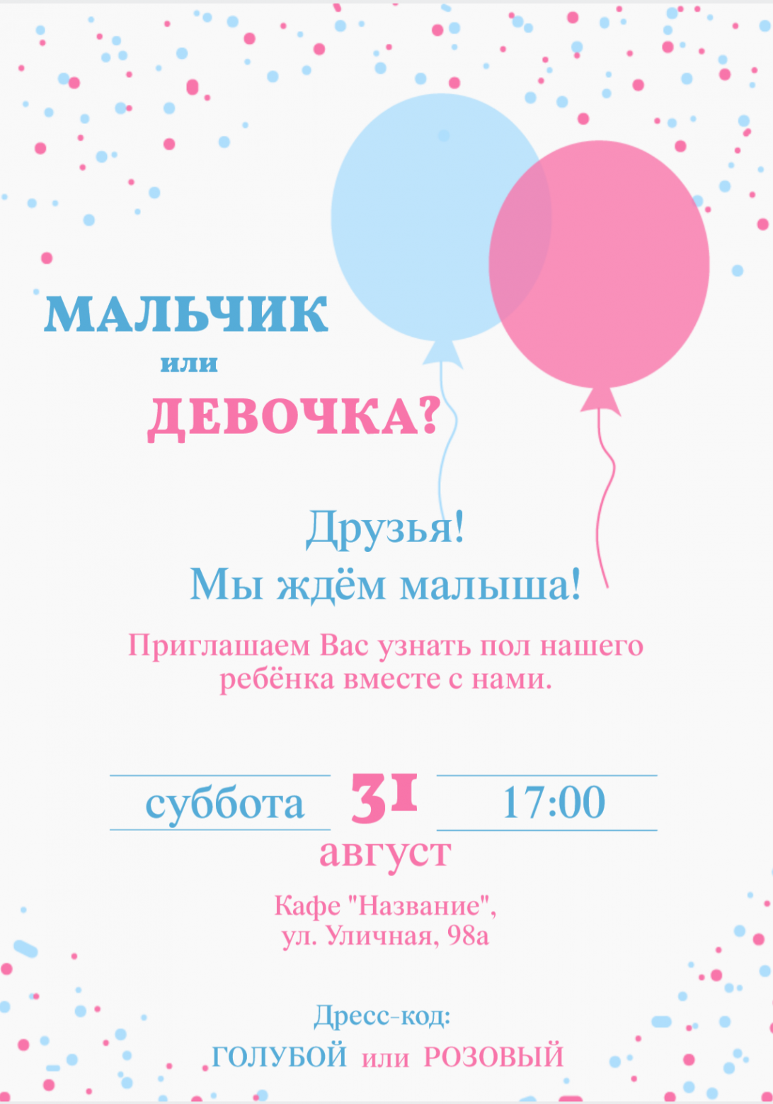 Приглашение на гендер-пати – это не просто формальность, а важный элемент создания атмосферы ожидания и предвкушения радостного события. Это ваш шанс поделиться волнением с близкими и друзьями, пригласив их разделить с вами момент открытия пола вашего будущего ребенка.