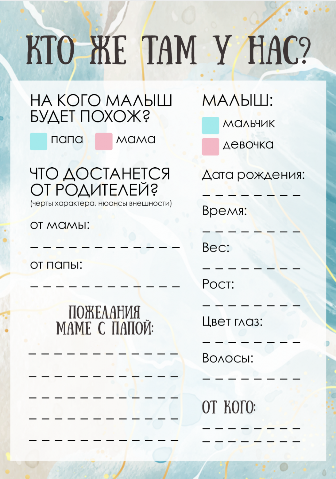 Развлеките гостей и создайте атмосферу: Анкеты добавят интерактивности вашему празднику. Гости с удовольствием заполнят их, делясь своими мыслями и предсказаниями о поле малыша.