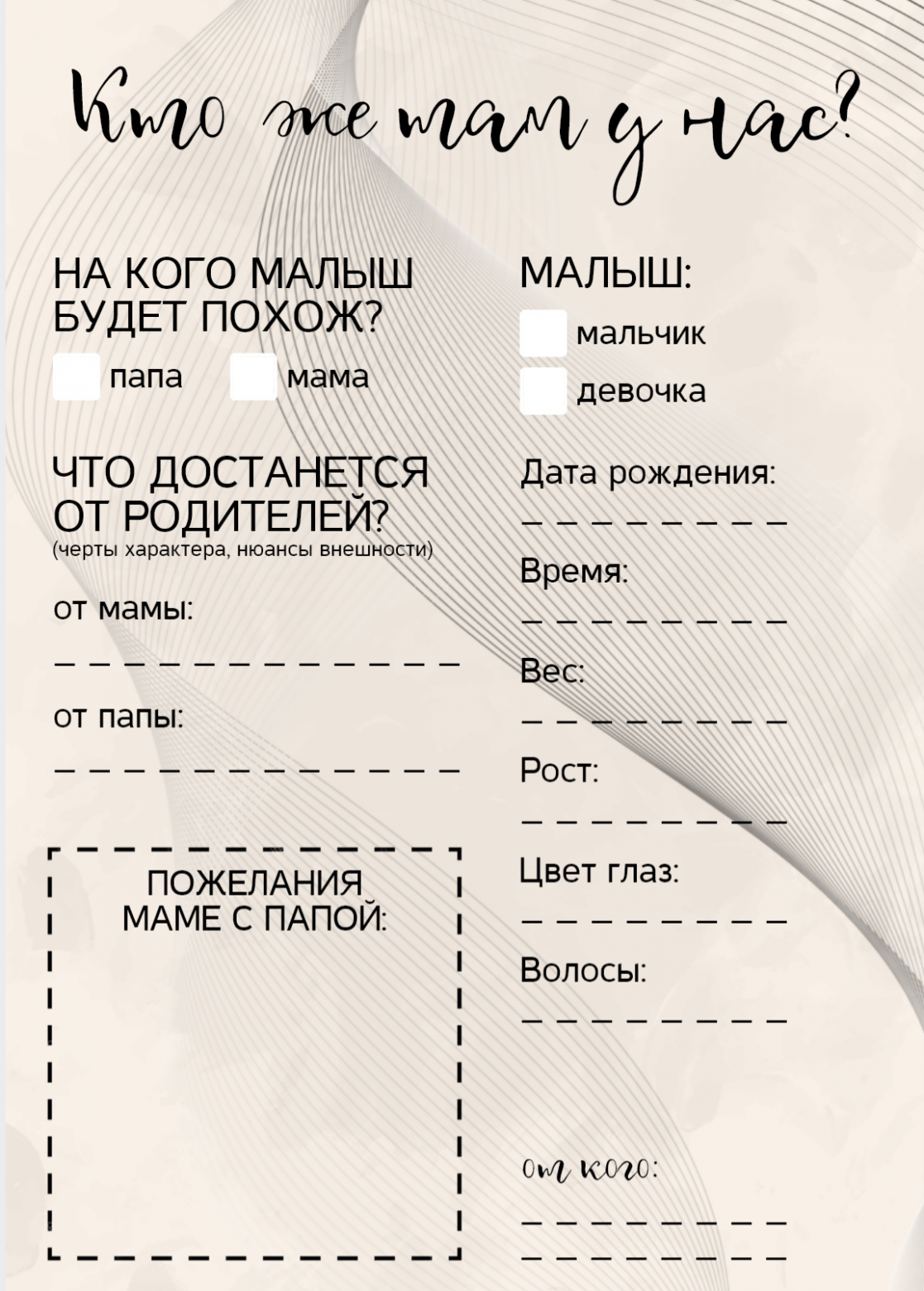 Развлеките гостей и создайте атмосферу: Анкеты добавят интерактивности вашему празднику. Гости с удовольствием заполнят их, делясь своими мыслями и предсказаниями о поле малыша.