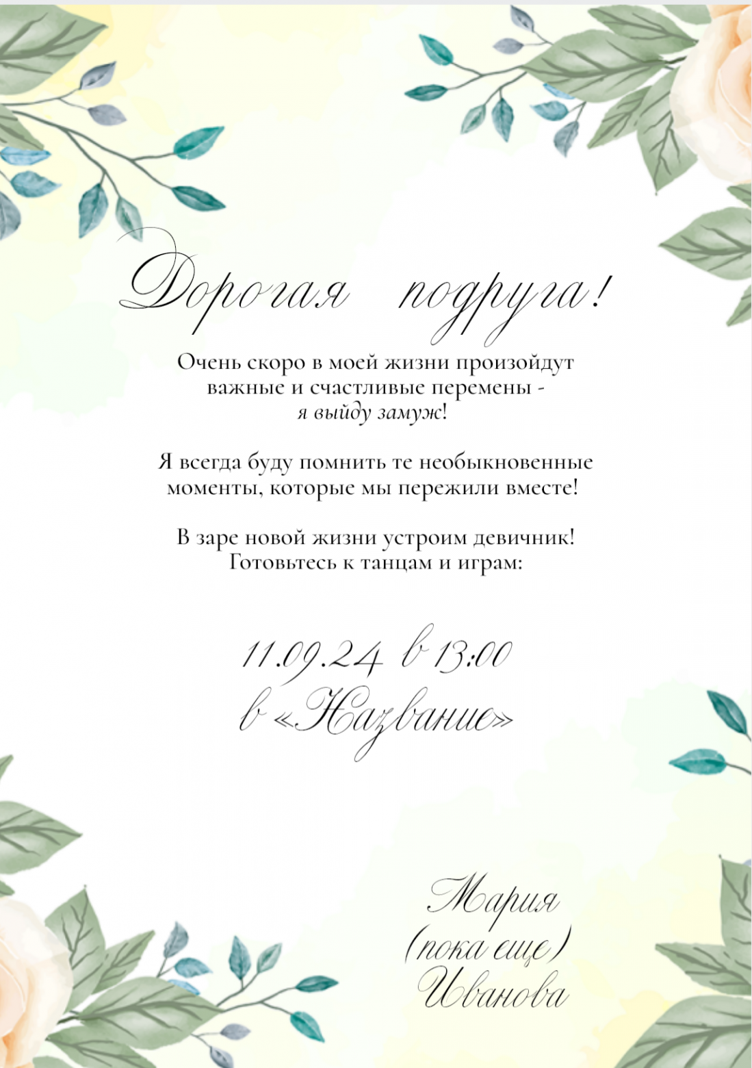 Мечтаете о девичнике, который запомнится на всю жизнь? Хотите собрать самых близких подруг, разделить радость предстоящего события и создать атмосферу праздника еще до дня свадьбы? Тогда забудьте о скучных сообщениях и одинаковых открытках! Представляем вам цифровое приглашение на девичник, которое станет ярким началом вашего незабываемого приключения. Отправьте его близким или распечатайте самостоятельно, если вам более удобен печатный формат.