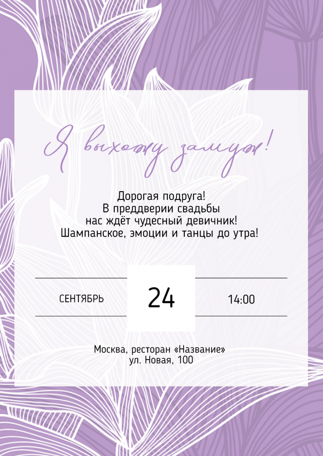 Мечтаете о девичнике, который запомнится на всю жизнь? Хотите собрать самых близких подруг, разделить радость предстоящего события и создать атмосферу праздника еще до дня свадьбы? Тогда забудьте о скучных сообщениях и одинаковых открытках! Представляем вам цифровое приглашение на девичник, которое станет ярким началом вашего незабываемого приключения. Отправьте его близким или распечатайте самостоятельно, если вам более удобен печатный формат.