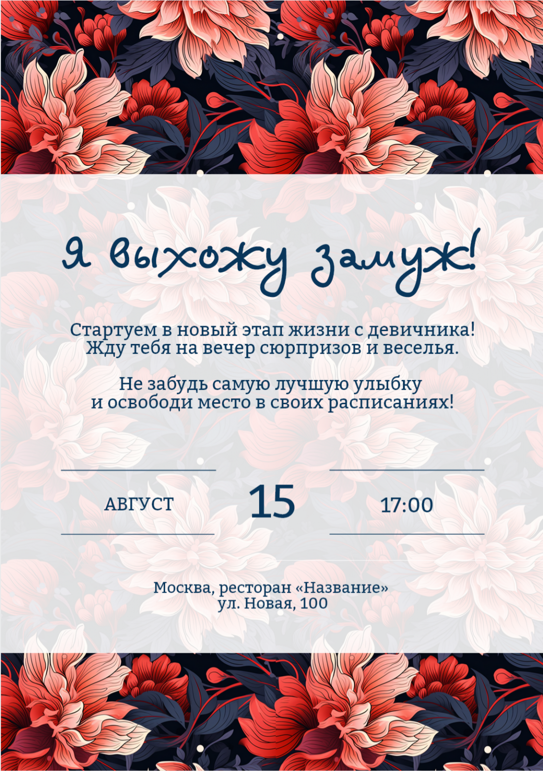 Мечтаете о девичнике, который запомнится на всю жизнь? Хотите собрать самых близких подруг, разделить радость предстоящего события и создать атмосферу праздника еще до дня свадьбы? Тогда забудьте о скучных сообщениях и одинаковых открытках! Представляем вам цифровое приглашение на девичник, которое станет ярким началом вашего незабываемого приключения. Отправьте его близким или распечатайте самостоятельно, если вам более удобен печатный формат.